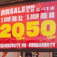 ※事前告知です。 12/29(土)~1/2(水) 衣料のみ 税抜¥5,000未満 50%OFF!! 税抜¥5,000以上 20%OFF!! 対象外もあります。 日程は営業日単位となります。特価衣料、取り置き商品は対象外で …