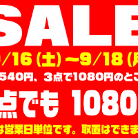 SALEのお知らせ Part3です!! 1点540円、3点で1080円の特価衣料のコーナーより、お得なお知らせ!! 9/16(土)~9/18(月) 通常1点540円、3点で1080円のところ、この三連休に限り、 5点でも …