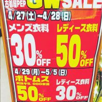 もうすぐゴールデンウィークですね!! GW SALEのお知らせです!! 4月27(土)〜4月28(日) メンズ衣料30%OFF レディース衣料50%OFF 4月29日(月)〜5月5日(日) 税抜5000円未満のボトムス5 …