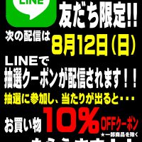 LINE毎月配信友達限定! 次の配信は8月12日(日) LINEで抽選クーポンが配信されます! 抽選に参加し、当たりが出ると・・・ お買い物10%OFFクーポンもらえます! ※一部商品を除きます。 ※ブロックしていると受 …