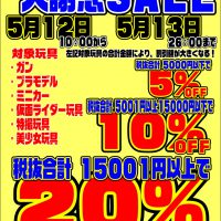 皆様こんにちはヽ(゚∀゚)ノ 5/10~5/13に行われるホビーの祭典、静岡ホビーフェアにあわせて静岡鑑定団ではセールを開催致します!! 5/12(土)13(日) ガン・プラモデル・ミニカー・ライダー特撮玩具・美少女玩具 …