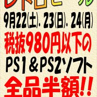 皆様こんにちは。レトロゲーム担当です。 9月22日(土)、23日(日)、24日(月)の3日間、 PS1とPS2のセールを開催します! 税抜980円以下のPS1&PS2ソフトが全品半額です!(一部対象外あり) この機会にレ …